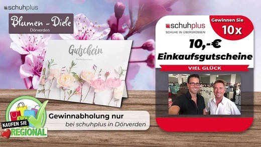 schuhplus gratuliert Nicole Kroschinski zum gewonnenen Gutschein für die Blumen-Diele 18. Aug., 2020 16:10 00:12 schuhplus gratuliert Petra Wahlers zum gewonnenen Gutschein für die Blumen-Diele 17. Aug., 2020 15:16 00:13 Blumiges Gewinnspiel bei schuhplus: verlost werden 10×10€ Gutscheine der Blumen-Diele Dörverden 13. Juli, 2020 15:20 01:18
