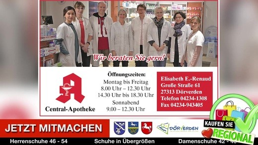 Glückwunsch von schuhplus an Rita Lühring zum Gewinn eines Gutscheins der Central-Apotheke 11. Aug., 2020 14:47 00:12 Glückwunsch von schuhplus an Heike Schmidt zum Gewinn eines Gutscheins der Central-Apotheke 10. Aug., 2020 10:58 00:12 Glückwunsch von schuhplus an Julia Kunert zum Gewinn eines Gutscheins der Central-Apotheke 05. Aug., 2020 16:37 00:12 schuhplus verlost 5×20€ Einkaufsgutscheine von der Central-Apotheke in Dörverden 06. Juli, 2020 16:08 01:10