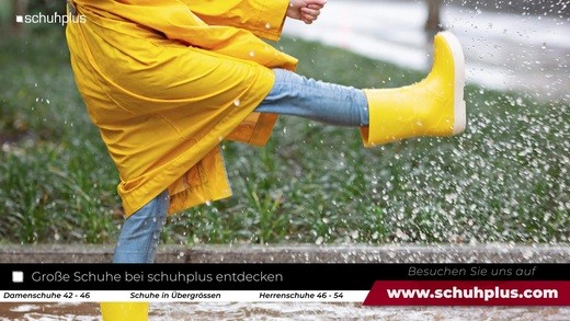 Gut gelaunt trotz Matsch & Regen: Gummistiefel in Übergrößen für Damen bei schuhplus 10. Jan., 2022 08:43 00:14 Gut gelaunt im Regen: Gummistiefel in Übergrößen für Damen und Herren bei schuhplus 17. Aug., 2021 07:40 00:14