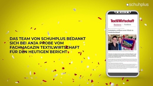 Anja Probe vom Fachmagazin Textilwirtschaft berichtet über neue schuhplus-Filiale in Leipzig 07. Apr., 2021 08:10 00:13 schuhplus bedankt sich beim Fachmagazin TextilWirtschaft für den Bericht 07. Sep., 2020 08:15 00:12 schuhplus bedankt sich bei Anja Probe vom Fachmagazin TextilWirtschaft für den Bericht 15. Juli, 2020 13:04 00:14 schuhplus bedankt sich bei Matthias Erlinger vom Fachmagazin TextilWirtschaft für den Bericht 09. Juni, 2020 13:49 00:13 Glitzer-Alarm – schuhplus-Bastelfee macht wahre Hingucker-Schuhe fürs Forum der TextilWirtschaft 07. Mai, 2019 16:49 05:17