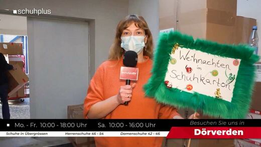 schuhplus – Schuhe in Übergrößen unterstützt die Aktion „Weihnachten im Schuhkarton“ 18. Okt., 2021 11:54 schuhplus bedankt sich bei der Verdener-Aller-Zeitung für den Bericht 11. Okt., 2021 13:31 Abholung der Geschenke von Weihnachten im Schuhkarton bei schuhplus – Schuhe in Übergrößen – in Dörverden 25. Nov., 2020 14:19 03:12 schuhplus in Hamburg unterstützte die Aktion „Weihnachten im Schuhkarton“ 24. Nov., 2020 13:17 01:41 Weihnachten im Schuhkarton: schuhplus unterstützt die Geschenkaktion für Kinder in Not 21. Okt., 2020 10:15 03:03 schuhplus ist wieder dabei: Weihnachten im Schuhkarton 2020 12. Okt., 2020 12:29 01:35 Endspurt! Paket-Abgabe bei schuhplus für Weihnachten im Schuhkarton noch bis 15. November 09. Nov., 2018 13:25 00:46 Weihnachten im Schuhkarton 2018: schuhplus in Dörverden ist traditionell wieder Sammelstelle für Geschenke der Hoffnung 17. Sep., 2018 17:20 05:03