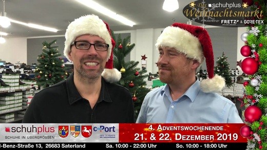 schuhplus-Weihnachtsmarkt am 21.12. & 22.12. am c-Port Saterland mit Programm für Groß & Klein 28. Nov., 2019 14:13 00:20 Outtakes TV-Spot-Produktion für ProSieben, SAT.1 und Kabel 1 zum schuhplus Weihnachtsmarkt am 21.12. und 22.12. am c-Port Sedelsberg 27. Nov., 2019 09:47 06:15
